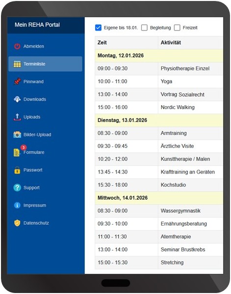 Echtzeit-Einsicht in Ihren persönlichen Therapieplan. Dieser wird direkt nach Ihrer Ankunft individuell für Sie erstellt. - Pinnwand